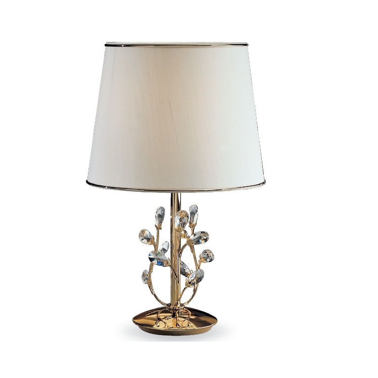 FINISAJE: ALAMA PLACATA CU AUR 24K , ABAJUR DIN MATASE NATURALA ALBA SI CRISTALE TRANSPARENTE